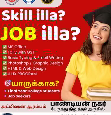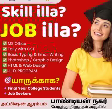 We offer coaching for ESLC and skill training in various fields including Tally, MS Office, and Graphic Design.